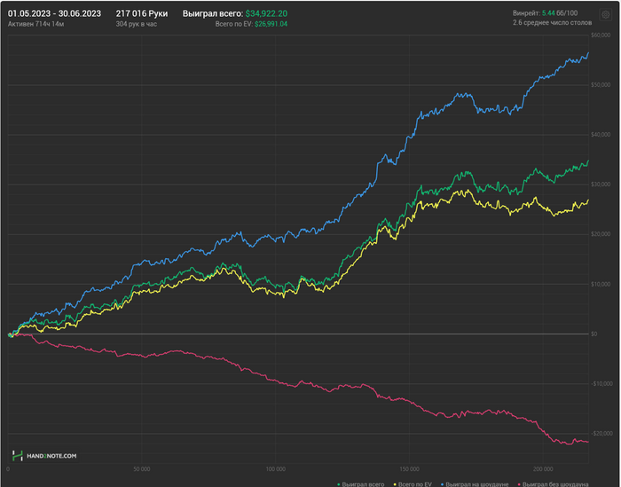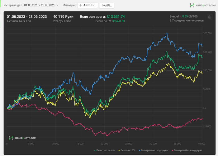 Собой в целом доволен, думаю играл где-то на 9\10 от своих возможностей почти каждый день, достаточно времени посвятил теории в июне, начал немного видоизменять страту в целом, от этого и находил мотивацию катать и учиться. Есть только один момент за который хочется дать себе в ебло, пару раз в месяц случаются раздачи в которых ну очень сложно проебать стек, но я справляюсь с этой задачей на 10\10. Условно споты которые можно в целом не играть, но почему-то не могу справиться с эмоцией в моменте, то впушу не туда, то придумаю себе и кечну хуйню какую-нибудь)))Помню мне как-то карачевский сказал одну дельную вещь "Если тебе захотелось изъебать оппонента в первые 5 сек после бета от него, то с вероятностью 99% это супер хуевый мув". И вот таких вот минусовых раздач я за этот месяц наиграл тысячи на 3)))