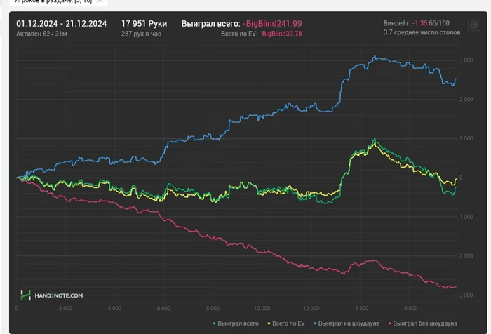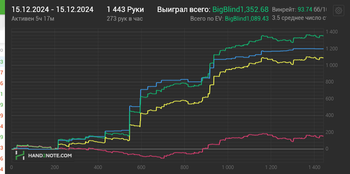 Месяц пока все равно в 0, тк на верхних уебало, на нижних побеждаем.(стандарт), но для истории запишем. Помойму это мой рекорд, почти 14би за сессию. Вообще бестдеи и ворстдеи за последние 100к рук я считаю показателем, насколько ты все еще бьешь свои лимиты. Если ворст превышает бест, значит либо ты катаешь около 0 - минус, либо у тебя проблемы с тильтом и ты катаешь замазочные сессии. Причем лучше смотреть по евшке, это более объективный показатель.