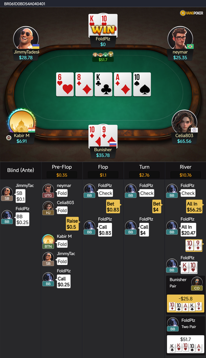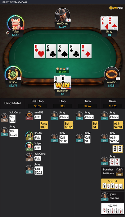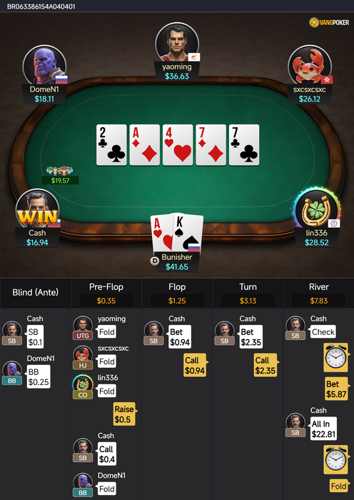 Против неизвестного получилась интересная раздача, открылся на бтн, получил колл на сб и донк 3/4, решил не рейзить сразу, хотя это предпочтительная опция, на терне продолжает за 3/4, здесь видимо уже нужно было рейзить в позе, по риверу получаю чек-пуш, из велью там фуллы на 22, 44, одна комба А7s, 7х там практически нет, блефы 56s, 4x, 33, 55, нижние допера А2, А4 бью, не простой пас на самом деле, если заложить все блефы на буквально 7 с копейками комб, то возможно колл и пролезет, но против неизвестного, скорее всего фиша, решил выкинуть.