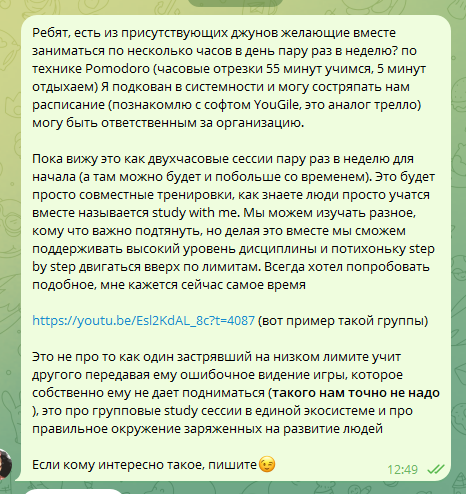 К концу этой недели хочу подготовить всё необходимое для старта небольшой группы study with me и на следующей неделе запустить первый тестовый поток, в будущем хочу сформировать постоянную группу из таких же заряженных на работу над своей игрой ребят, чтобы я их, а они меня подпитывали продолжать много работать учиться, а не просто играть нонстоп как только начнутся первые результаты и заработки, оставаясь на одном уровне