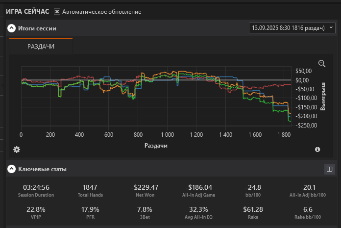 Привет всем,добрался наконец-то столов(лучше бы не добирался).Вначале привыкал снова кнопки нажимать,потом вроде адаптировался.Но под конец просто в одну калитку нараздавали говна и сам наколил лишнего.С учетом сундука(10.5$) -220$ сегодня.Теперь точно спускаюсь на нл25.Шот лимита нл50 неудачный.Разнесли меня в пух и прах и реги и фиши.