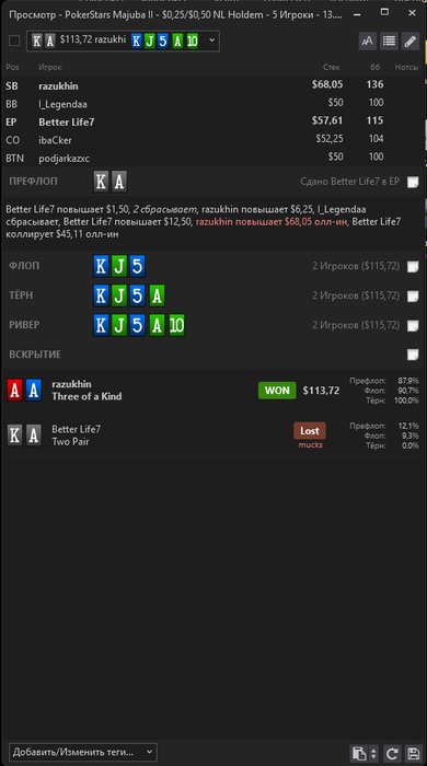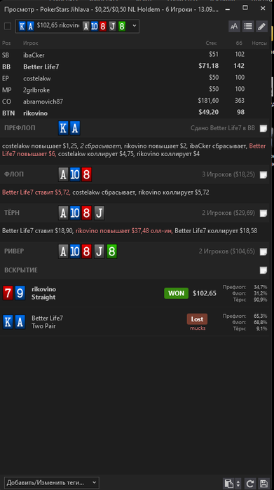 в третьей раздаче АКs в Аа. Конечно , можно назвать кулером и катать дальше, но в общем и целом , мне в таких спотах нравиться играть одномастные туз король колом против трибета , в позиции. Вроде прошли те времена, когда были популярны 5б пуши с блокерами и все такое. Пушат JJ+ и АК. Колом мы часто будет обагрывато те же ак, потому что мы в позиции
