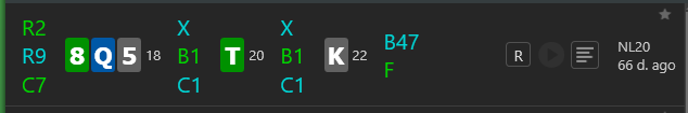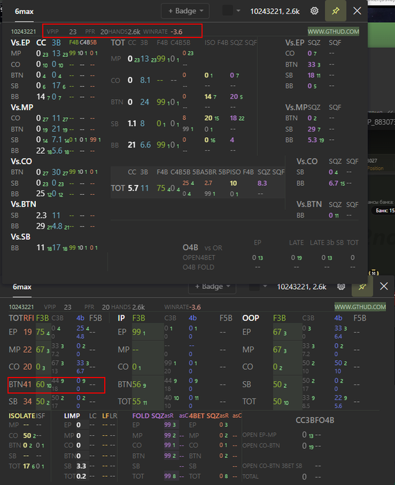 2.6к рук выборка небольшая, но уже видим, что оппонент рег, который не любит падать на 3бет. Информация по 4бетам на это кол-во рук не успела набраться. По-этому пляшем лишь только от показателя фолд на 3бет тот 52 (на бтн 60, что тоже недостаточно). Вообщем дефолтный оппонент микролимитов - рег, телефонящий префлоп🙃