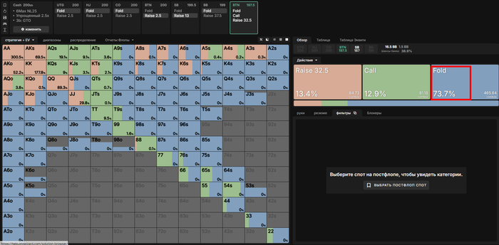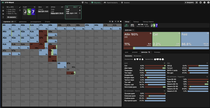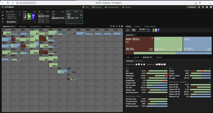 Казалось бы у оппонента целых 22% рейза, что довольно-таки много. Но текстура борда подразумевает много сильных дро у опа и много натсов + околонатсов. По-этому как его готовые руки, так и его дро имеют хорошее эквити и солвер просто фолдит как мразь!