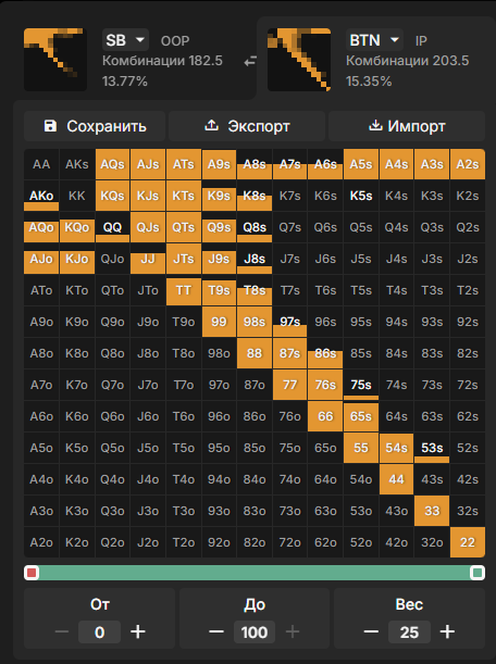 имеем такой ренж, и это с учётом, что оппонент фолдит 73% на 3бет.