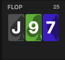 2. Флоп связанный, оппонент хорошо зацепился, больших фолдов от оппонента не ждём. Играем ренжом за треть (с оверпарами/топ-парами не сильно хотим в дипах разгонять банк на такой текстуре; с гатшотами/оесд толкаем эквити за приемлимую цену.