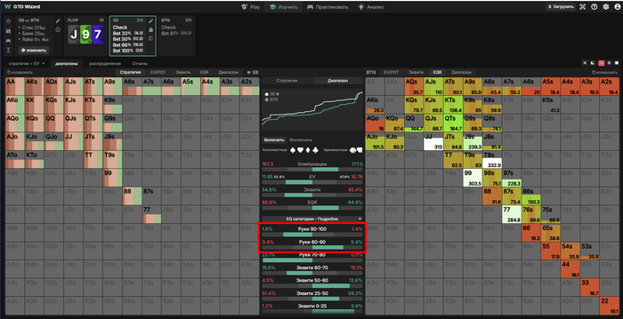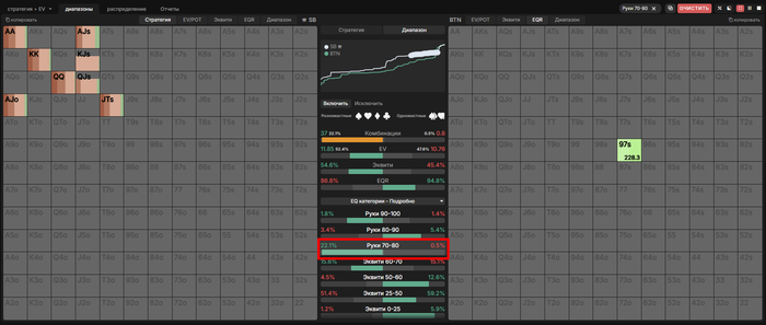 Видим, что натсового перевеса у нас нет (№1 на скрине). Но есть перевес по всей остальной части ренжа, особенно в части 70-80% эквитийных рук (о чём я и писал выше - в основном засчёт оверпар)