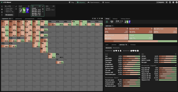 Засчёт того, что ИП рейзит часть готовых рук с неплохим потенциалом на усиление, солвер начинает пушить свои оверпары, тем самым недавая легкую реализацию этим рукам. Миксует это дело с нижним сетом, JTs - топ пара + гатшот и оесд КТс бекдорные по большой части.