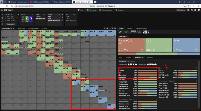 Что я залочил? с высокой частотой рейз всех натсовых рук (сеты, допера, стриты), 50/50 оесд, добавил высокую частоту рейзов гатшотов (без совпадения). Все руки, которые имеют шд + усиление (2я пара+гатшот, топа пара + гатшот) увёл в кол.