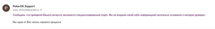 Зарегался в ноябре 2024. Пришел с медиа покера вообще нулевой. Было интересно разобраться в игре, даже взял пару тренировок. Активно покатал турниры по 1-5 баксов пару месяцев, ну и в январе 2025 как-то потерял запал, вообще забросил покер. Депнул всего примерно баксов 150-200, откатал в плюс минус ноль (повезло в турбинке занял топ 6 и выиграл 450 баксов, без этого был бы жесткий минус). В июне 2025 открыл опять покерок, пару дней поиграл и получил фриз. После требования видоса с номером дома забил на эти 150 баксов на балике, но сейчас решил вернуться к этому вопросу, скинул, ну и запросили видео игры. Я так понимаю, тоже ждет бан.
