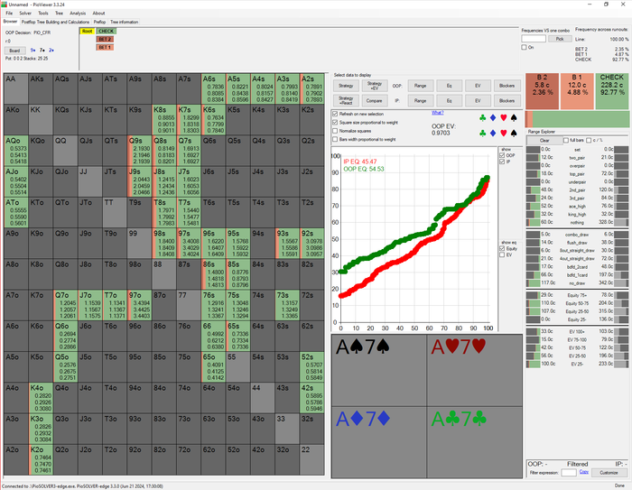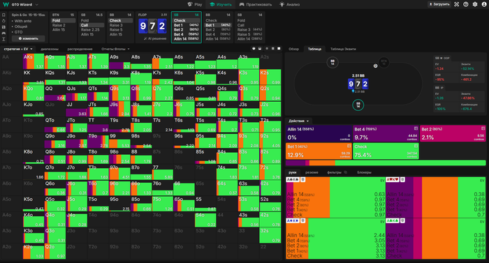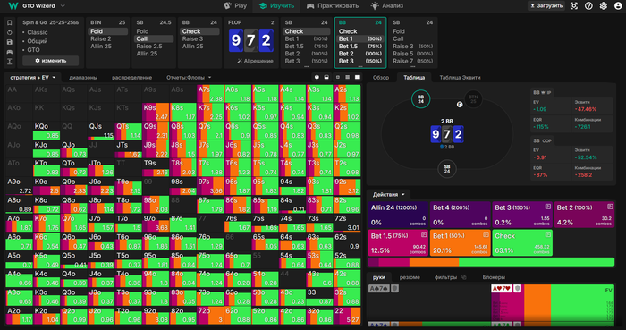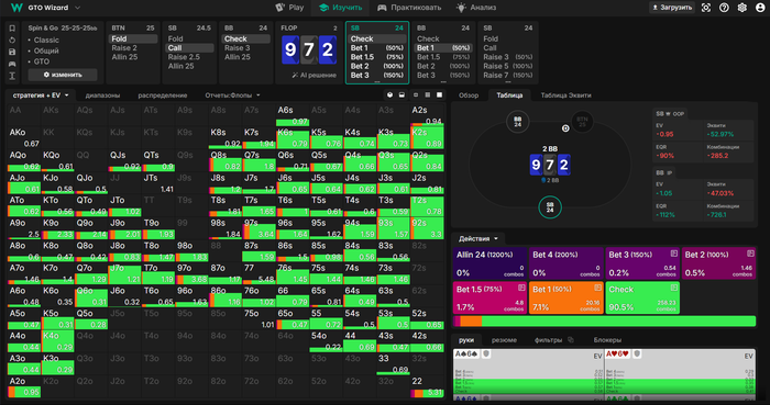 Вообще не понял логики чека 90.5% без позиции. Как я понимаю, идея в том, что борд хорошо подошел диапазону соперника. Но все равно не понимаю чек практически в полном весе по девяткам, никогда бы не сыграл так в реальной игре. Что интересно, солвер еще и чекает многие девятки на бб