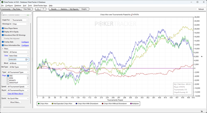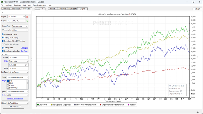 В целом, результат по чипев совсем не тот, который я ожидал. Результат по деньгам получился отличный, +1982$, но тут сказался довольно таки большой перебор, без него все было бы не так радужно. Думаю сентябрь должен получиться получше по результатам, планирую подняться на пятерки, но прямо сейчас банально не позволяет банкролл. Зная, какие просадки бывают в спинах, хотелось бы иметь хотя бы 200 - 250 би.