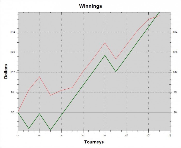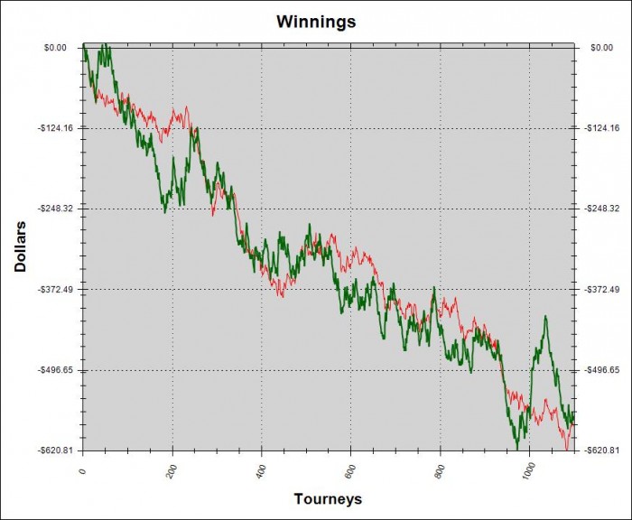 Первые 100 туров эксперимент с 6-макс, как видно он вообще не удался -12БИ, потом перешел в 9-макс, но там меня ездили еще -20БИ, а потом начал катать кнокауты, если судить по графику то хреновастенько я их катаю))) но ХМ не учитывает баунти, точнее учитывает 5-7% всех баунти...