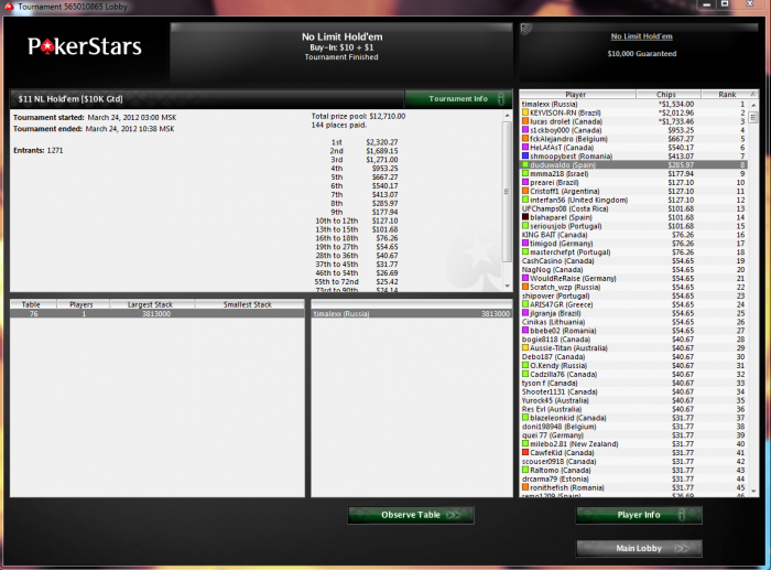 Poker Stars $10.00+$2.50+$1.00 No Limit Hold'em Tournament - t40/t80 Blinds - 9 players