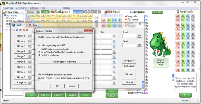 1) Запускаем ФлопЗиллу 2) На кнопочке меню, которая запускает ХолдЭк / HoldEq есть два пункта: а) Запустить ХолдЭк / HoldEq б) Сгенерировать активационный / регистрационный ключ для ХолдЭк / HoldEq 3) Нажимаем "Сгенерировать активационный ключ для HoldEq - получаем циферки, копируем их в буфер. 4) Запускаем HoldEq, у тебя на скриншоте есть кнопка "REGISTRED" нажимаем ее, и вставляем циферки из буфера - ВСЕ ПОЛУЧИЛОСЬ 5) Выключаем HoldEq, Выключаем FlopZilla - теперь все готово, можно запускать заново - софт активирован