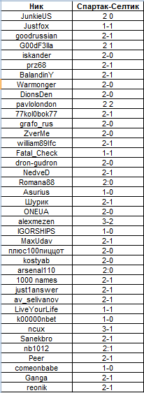 многие (я и Искандер, например, судя по сходству прогнозов) делают ставки на основе коэфов букмекеров, а никак не из-за составов команд. + собственные поправки "в надежде" или еще как, как в случае с завтрашним Зенитом (игра будет равна: сыграют два гавна (С) перефразировка). а коэфы меняются неохотно.