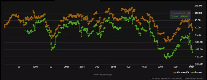 По факту. -0.5 БИ за день. Очень очень много где 80% поделили с оппами, очень много сетов, даже в какой-то момент тильтанул, что видно в середине графика =)