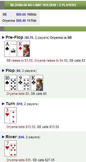 You could make the algorithm for doing all this as simple or as complicated as you like but basically the job of it would be to use the data gained by all of these different table cap numbers to predict what a good table cap should be at any given time and then it would move around a bit about that number to account for exactly who is online at that time. If you wanted, you could link this with the forced hands option with the alteration that you can refuse action after x hands/day vs someone. People would then have to play some for the right to sit and then also action would be encouraged whenever it was looking a bit dry at any limit. I think this would maximise the amount being played about as well as it is possible to do and shouldn't be open to massive exploits. You could also have the starting table cap number different for each day/week or whatever so that people might be more encouraged to take a shot when there's a high table limit at the limit above where they play. Also this gets more data for how well different caps do. I was going to go into more detail but decided my time would be better spent losing nearly half a mill at 400/800 and now want to go to bed rather than finish this post lol. But you get the general idea already, can go into more detail another time if stars are interested in something along these lines. (с) Кану