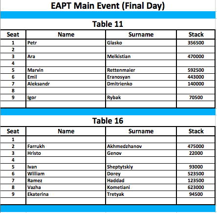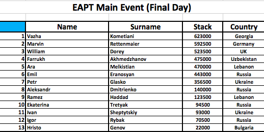 Игра была остановлена за 9 минут до окончания 16-го уровня. Завтра EAPT Main Event продолжат 13 участников. Среди них Катя Третьяк со стеком 94,5К. А лидирует в турнире Важа Кометиани - 623,000.