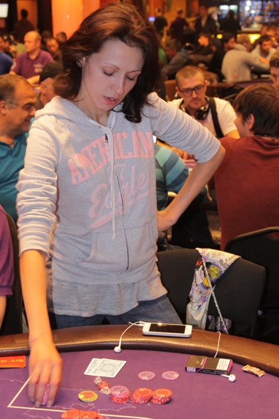 Катюша устроила шоу! Осталось 15 минут до конца последнего уровня, и в Третьяк, которая была на большом блайнде, прилетел олл-ин от "коротыша". Впрочем, стек у нее был немногим больше, и когда все до ББ выкинули... она начала думать. Посмотрела одну карту, потом вторую. Встала со своего места. Прошлась. Снова села, прогулялась вдоль стола, и со словами "я не хочу вылетать", трижды пересчитав свои фишки и еще раз встав со своего места и посмотрев в карты... все-таки заколлировала с ! "Как бы у вас не было десяток" - сказала Катя потухшим голосом. Какие там десятки! Соперник разочарованно перевернул .
