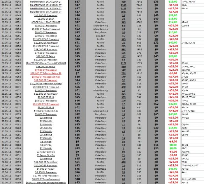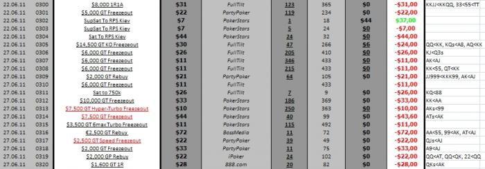 Мало играю последнее время, дорогие турниры от дольщика... беда с покером полнейшая, залил весь плюс, который был с начала года. Игра вообще не идет, ничерта не получается ( Результат на -$1,2k, с рои -60% Примерно так выглядит таблица(без учета доли бекера):
