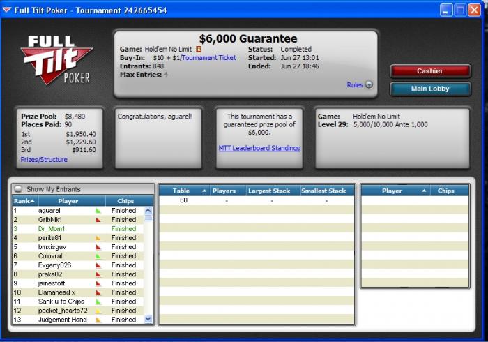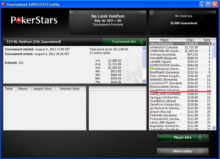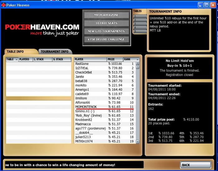 В целях отказа от алкоголя, вчера поспорил с любимой, что не буду уничтожать зло, пока не получу МТТ топ3 с должными призовыми. Дополнительная мотивация всегда помогает! )))