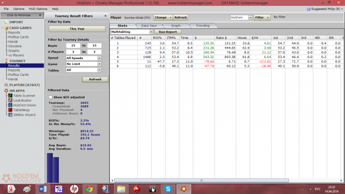 lukoil @ 14.4.2014 в принципе это проверить минутное дело в ХМ1, человек дело говорит В графе stats фильтруешь не по stakes, а по multitabling, И можно увидеть РОИ когда играл 1,2, 3 и т.д столов