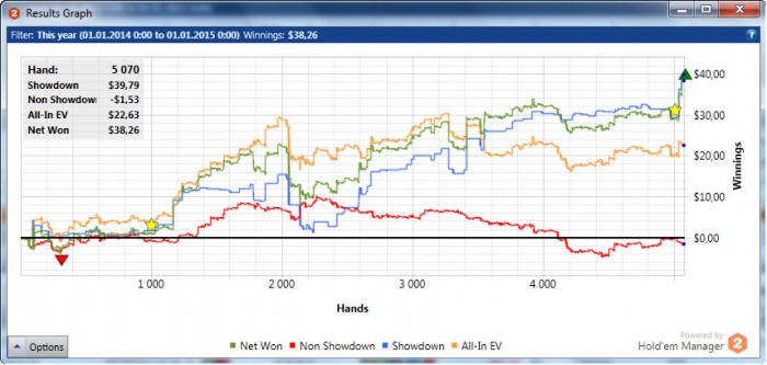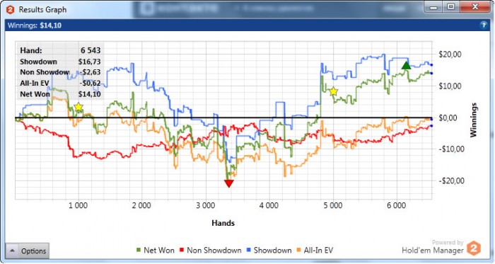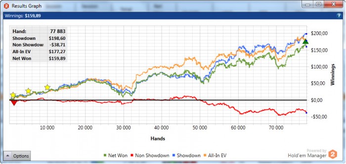 Отыграл 3 сессии. Во время первых двух играл не оптимально, по истечению которых (2к рук) откатал в ноль Очень подпортил красную Перед сном решил покатать еще немного (653 руки). Получилось неплохо И красную около нуля держал)