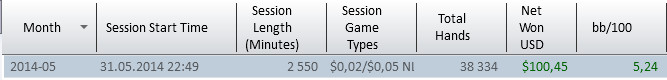3. Посмотрел лишь два ВОДа. Руки разбирать так и не начал Гребаная лень Выводы: Дисциплинированный май прошел на 3 из 5. -: Были две абсолютно лишние лудосессии (их видно на графике). Лень заниматься теорией +: Хватило дисциплины, чтобы не лесть выше НЛ5 и не играть лишние сессии.