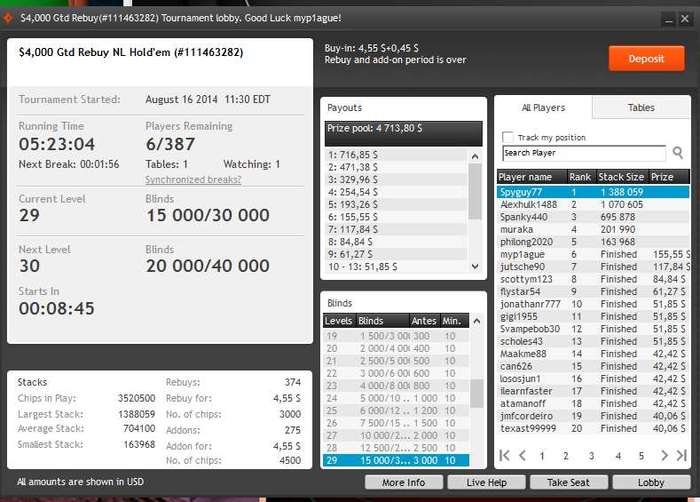 Сегодня днём почти не играл, всего пара турниров, потому что надо будет отлучится, забрать отца с братом с аэропорта