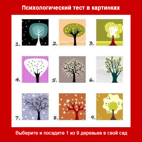 Люблю тесты по психологии) Вот один из них. Может кому тоже будет интересно. Представьте, что вы садовник в большом и красивом саду. Пришла весна, и вам нужно посадить в своем прекрасном саду новое дерево. Перед вами участок, на котором растет девять необычайно красивых деревьев уникальных пород. Но вы можете выбрать только одно из них. Внимательно посмотрите на картинку и выберите одно из девяти деревьев. Ответ кину, если кому понадобится) Про меня правду сказал тест =)