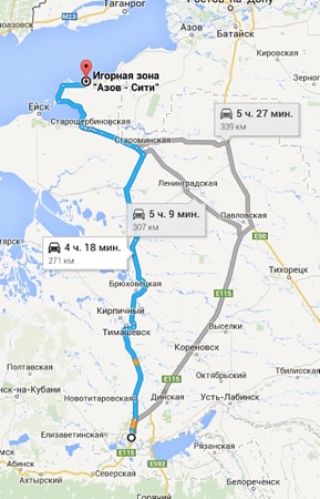 Поскольку Азов-сити лежит на стыке Краснодарского края и Ростовской области, разумно предположить, что есть два пути - через Ростов-на-Дону или Краснодар.
