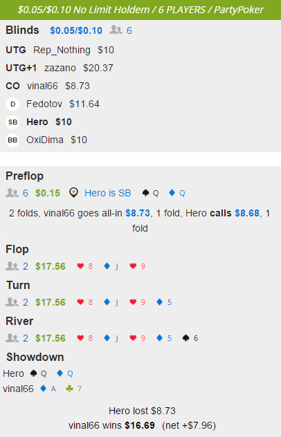 Минус 5 стеков за 500 рук, как-то отбили желание катать сегодня А было такое боевое настроение... но лучше прекратить на сегодня, а то чувствую что поплыл.