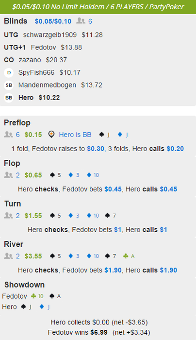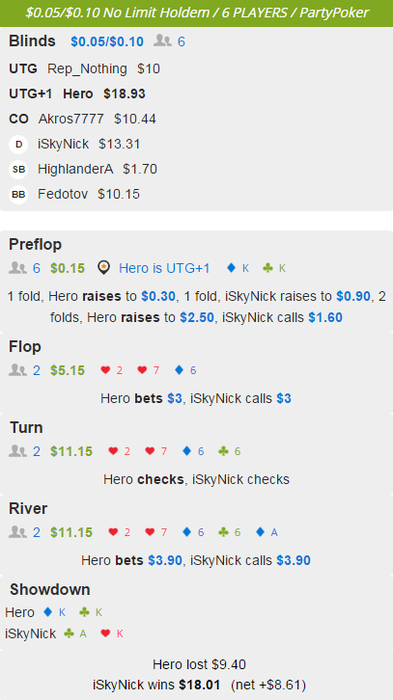 Это одна из тех раздач, которые, пожалуй способны вогнать меня в тильт. Опп сильный плюсовый рег, на которого много рук. Если бы я продолжил ставить на терне, то свои JJ и QQ он выбросил бы точно. Я решил прочекать, чтобы забрать на ривере стек с его JJ и QQ, ну и возможно добрать с блефа АК. Бояться мне особо не чего, т.к. из флеш дро у него могли бы быть только , но они пихали бы олл-ин на флопе. все остальные его руки имеют всего 2-3 аута. Ослепленный ривером, я сыграл судя по всему очень глупо. Хотя чекнув, мог бы получить блеф (большего сайзинга) от карманок ниже...