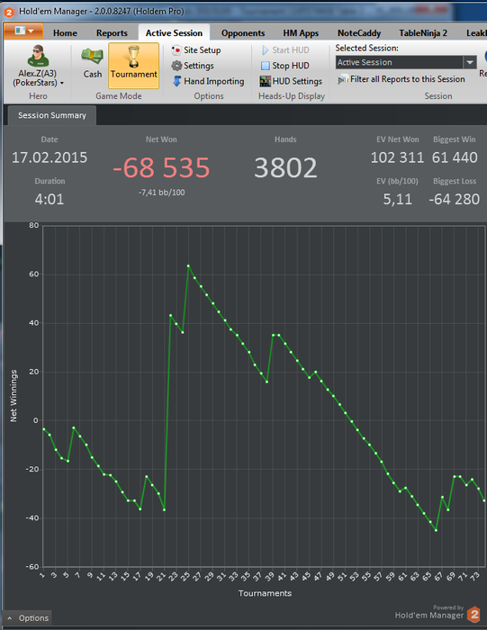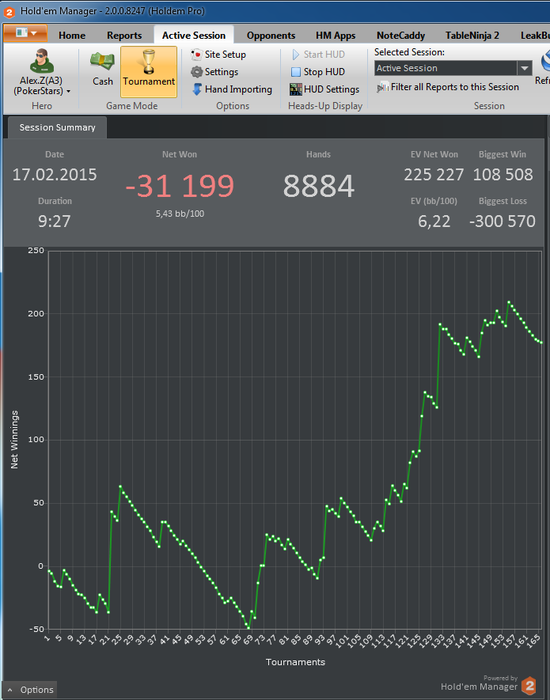 Пример: если мы удвоили стартовый стек (допустим 3000) на блайндах 50/100, а потом выставились и вылетели на блайндах 250/500, то мы выиграли 30бб, а потом проиграли 12бб, т.е. в среднем показали положительный винрейт.