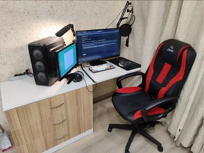 1. Сменили квартиру, правда меня малость обманули, джакузи тут не оказалось, а сама квартира 42 квадрата, зато кухня и спальня фулл фарш, жена в восторге. Из спальни меня выперли, живу теперь на этой самой кухне. Личный кабинет, который закончил на квартире в Перми, теперь мне только снится. По эргономике - жопа. Кресло самое дешманское за 150$ взяли, как затычку до переезда, отдам жене, пусть страдает. Стол норм, но лапки не вытянуть и ширины маловато, упираешься в монитор, тоже нужно менять. Рабочее место выглядит пока так: