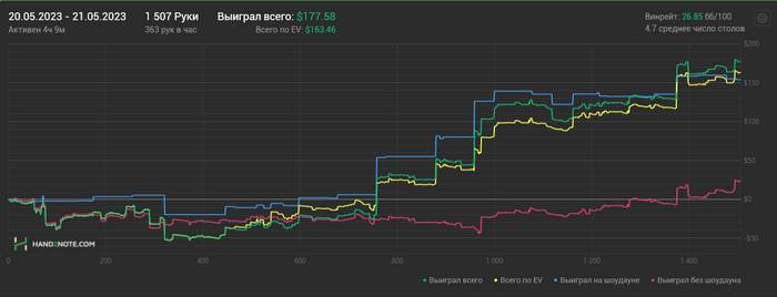 21.05.2023: 4.09ч, 1507 рук nl25/50 +$224.