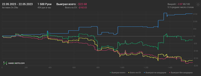22.05.2023: 3.29ч, 1588 рук nl25/50 -$51.