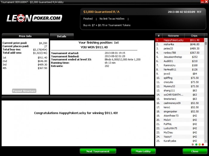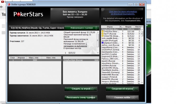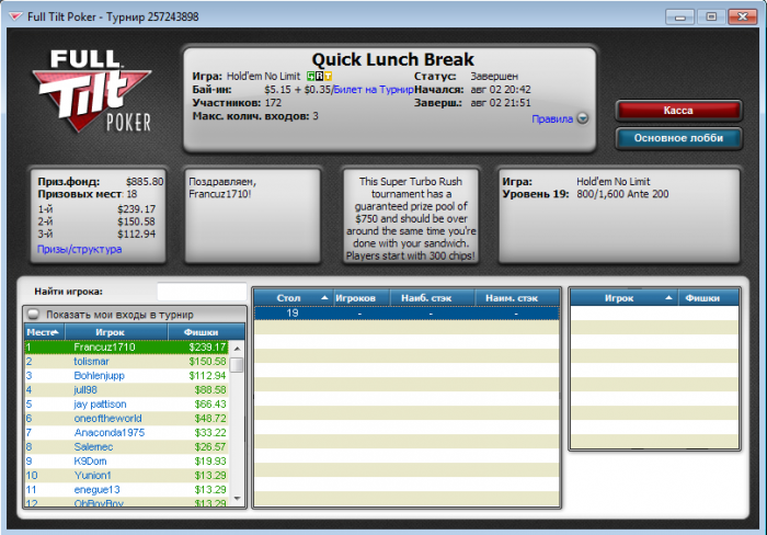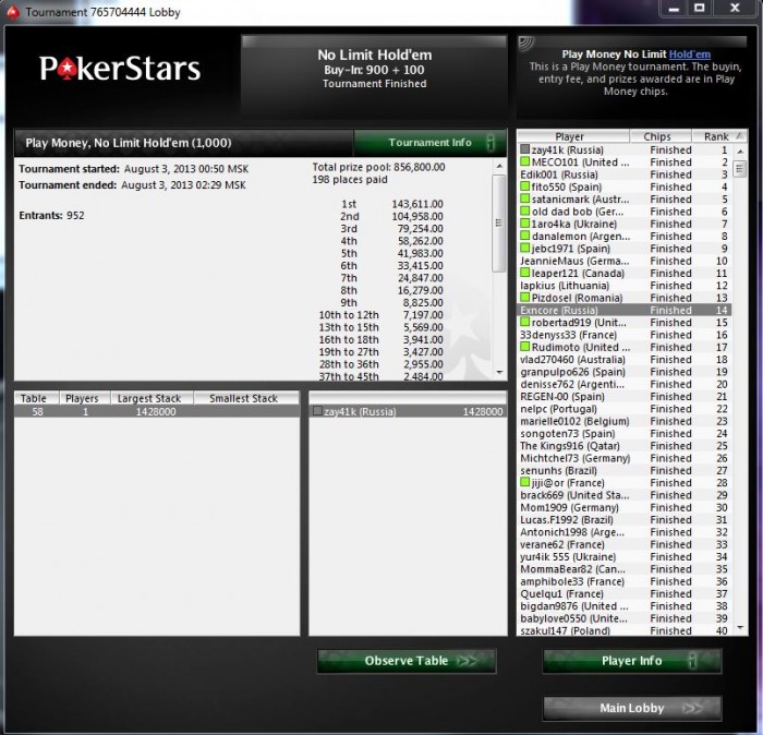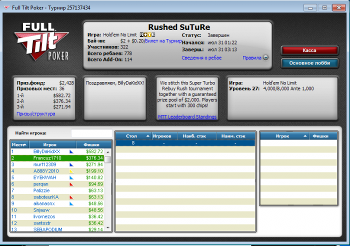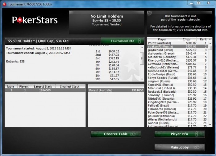 Начало было как обычно, залился, стек был меньше половины. Паралельно игре начал смотреть вод Fanjke где он катал воскресный турик за +500. И перешел с нитово-фишового стиля на жуткого агрессора играя в основном 3 бэт, 4 бэт, стилы и пуши. В итоге результат, самый крупный мой занос. Кстати с Fanjke пересекался в прошлом по Fife на Аsus`e 2007, не удивлен, что он и в покере достиг хороших результатов.