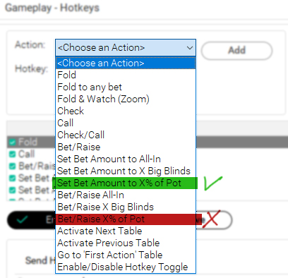 Можно и так. Но! При Bet/Raise по F1 вы сразу будете ставить 30% банка. А при Set Bet Amount клавиша F1 будет выставлять ставку в значение 30%, и у вас еще будет возможность с помощью колеса мыши подкрутить размер ставки (работает, в каком бы месте стола ни находился курсор). Например, нажал F1 и подкрутил мышкой до 37%. В меню Bet Slider - Incremental Adjustments можно выбрать, чтобы колесо мыши меняло размер ставки в МБ или в ББ.