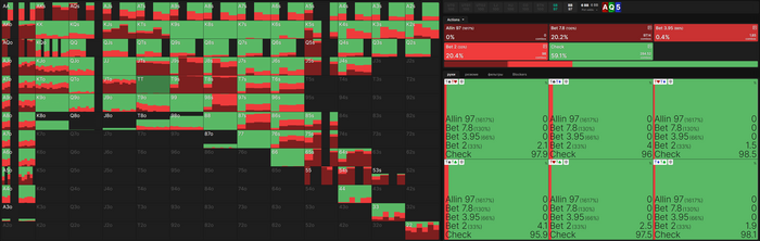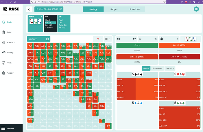 Прям интересно, простая вроде ситуация, открылись мы с SB, BB колит, борд . Оказывается, аж в 20% у нас овербет 240% пота есть, это 5х самые слабые, гатшоты большая часть, сильные Ах и доперы с тузом.