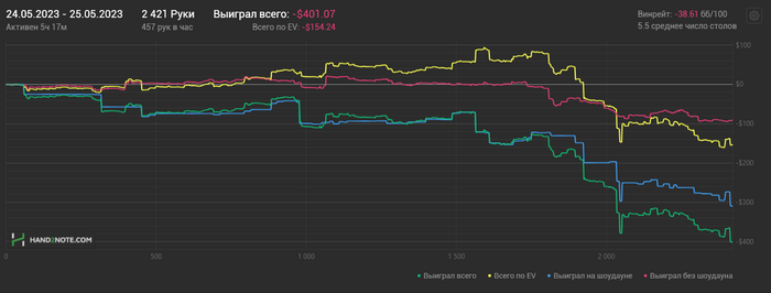 25.05.2023: 5.17ч, 2421 рук nl25/50 -$391.