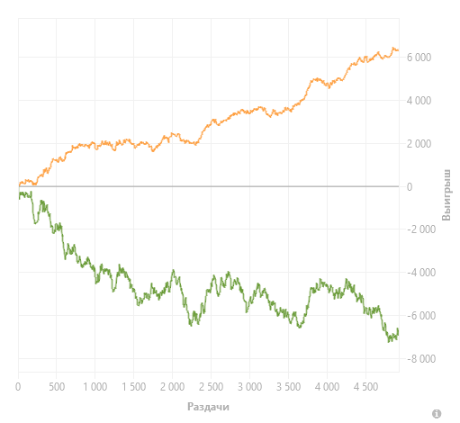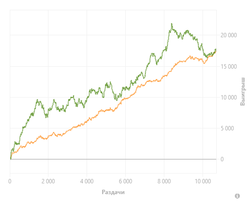 Шансов вообще не давали. И это при том, что этот график не отражает ещё скрытую недодачу. Типа когда едешь префлоп с A9s против Т4о, попадаешь на флопе в допер, типа А93, тёрн Т, ривер Т. И такие раздачи происходят с потрясающей регулярностью.