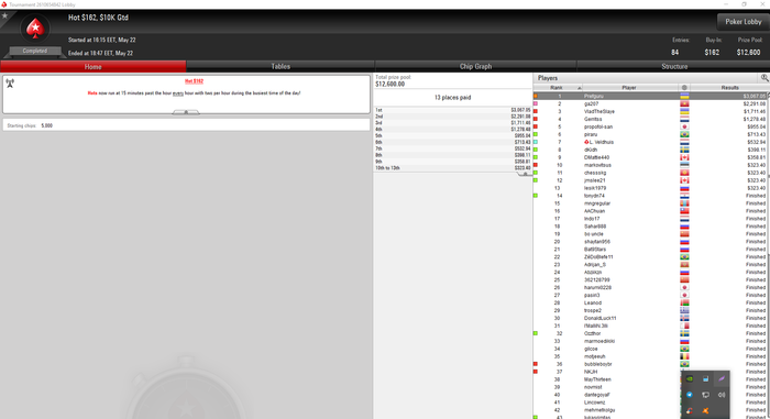 Poker Stars, $27 Buy-in (125/250 blinds, 30 ante) No Limit Hold'em Tournament, 9 Players