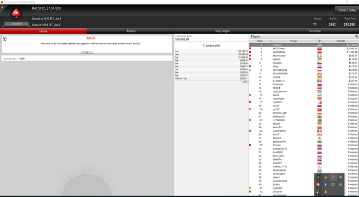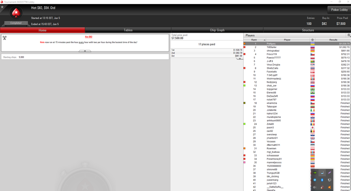 Poker Stars, $100 Buy-in (1,250/2,500 blinds, 325 ante) No Limit Hold'em Tournament, 7 Players