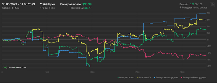 31.05.2023: 4.47ч, 2269 рук nl10/25 +$28.