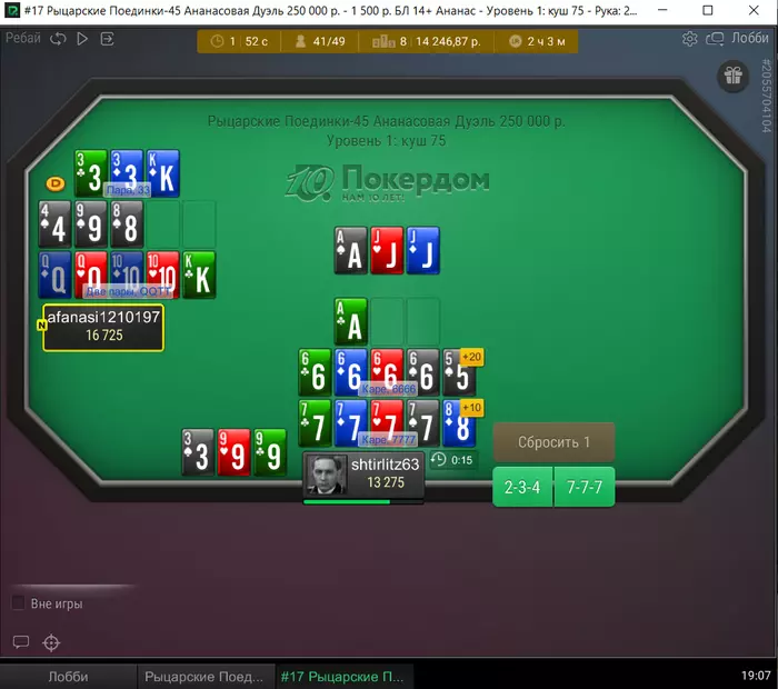 Попробуй поотвлекаться на игру чела с ником НСК, это точно +Ев будет, оч сильно играет, на нас с пиле конечно спасибо но я его пытался быстро выбить , апчик у меня был нейтролизирован, потом просто тянул время чтобы в паре раздач разойтись, он немного поплыл в паре сложных раздач и не стал собирать фантазии , а у меня плотнейшие раздали и гг, потом ещё рега посадили и до призов вылетел чуть чуть не хватило, тянул бы с пиле время сразу, попал бы в призы... Ошибка была меситься с регом, твой опп на удивление плотно заиграл против тебя