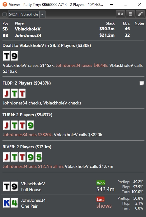 Игра проходила именно в таком ключе: небольшие банки туда-сюда, но с ТП+ нужно было просто играть "Check-check-check", и в трёх крупных банках он с готовностью отдался. Последняя раздача отлично это проиллюстрировала: