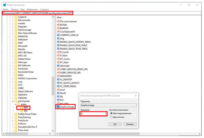 · После входа в него перейдите в папку: HKEY_CURRENT_USERSoftwarepacificpokerINIT.