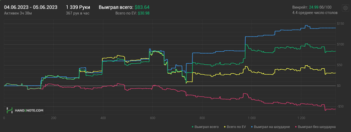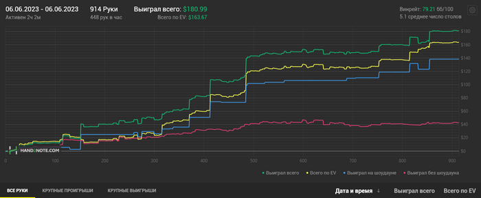 06.06.2023: 2.02ч, 914 рук nl25 +$175.